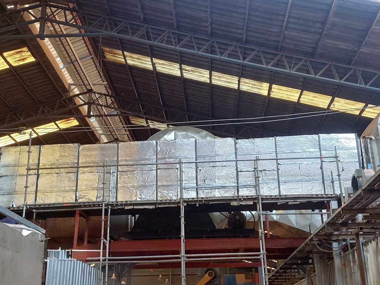 El proceso de aislación consistió en realizar el montaje de tres capas de material, las cuales se fijaron a través de una soportería de hierro soldado, y el recubrimiento mecánico se fabricó y montó con chapa de acero galvanizado.